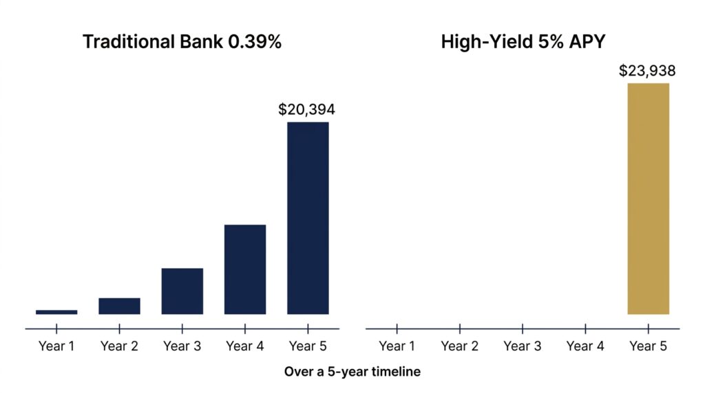 Your emergency fund at 5% APY versus 0.39% APY is worth hundreds to thousands of dollars per year in additional interest — money that compounds, year after year, into a meaningfully larger safety net.
